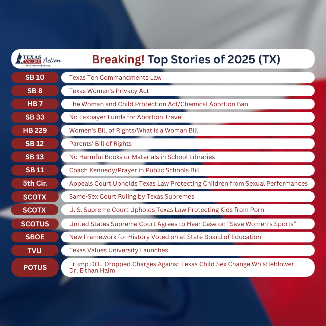 Texas Values Action has also released one of the most comprehensive legislative scorecards in Texas, scoring every member of the Texas Legislature based on their voting record for faith, family, and freedom. Check out our Faith & Family Scorecard today.